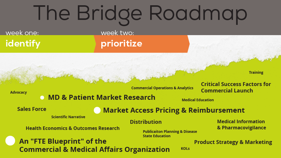 The iterative process of developing the Bridge Roadmap informs the prioritization of which long time line commercial imperatives need to be initiated and which key personnel need to hired. We gain alignment with the Executive team on both the 30 day and 180 day prioritization. With Executive team alignment of the Commercialization priorities, we begin the actual commercialization imperatives and key FTE searches.